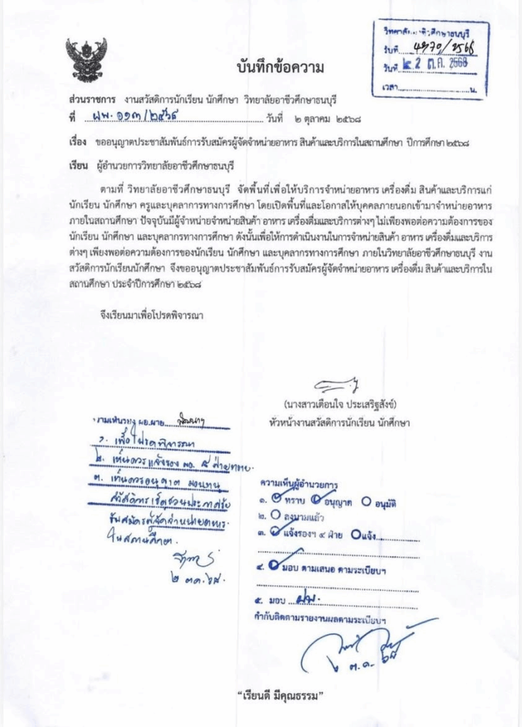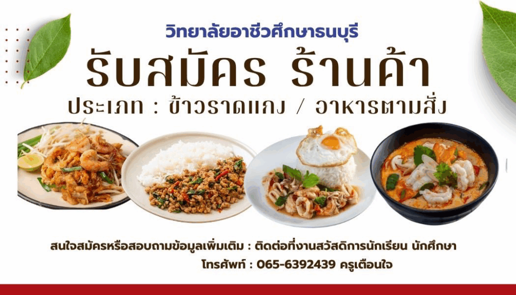 ตามที่วิทยาลัยอาชีวศึกษาธนบุรี ได้จัดพื้นที่ให้บริการจำหน่ายอาหาร เครื่องดื่ม สินค้า และบริการต่าง ๆ แก่นักเรียน นักศึกษา