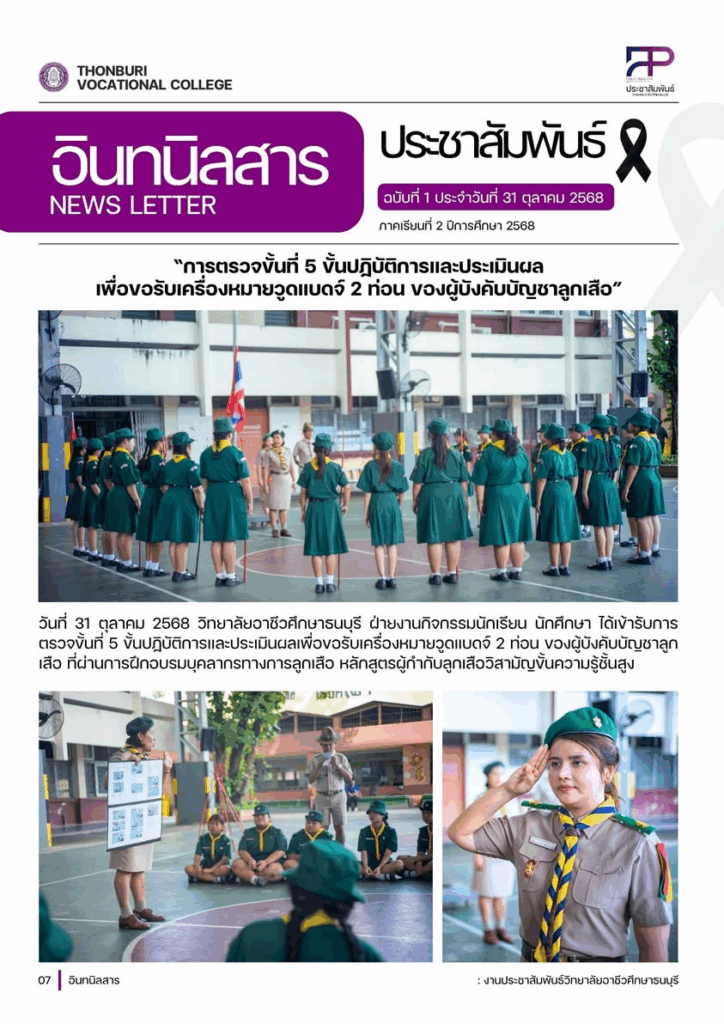 วันที่ 31 ตุลาคม 2568 กองลูกเสือวิทยาลัยอาชีวศึกษาธนบุรี ได้รับเกียรติจาก นายธราเชฏฐ์ สุคนธ์ ผู้อำนวยการวิทยาลัยเทคนิคดอนเมือง เป็นกรรมการผู้ทรงคุณวุฒิในการตรวจประเมินขั้นที่ 5 คือ การประเมินผลการปฏิบัติงานจริงสำหรับบุคลากรทางการลูกเสือ (ผู้บังคับบัญชาลูกเสือ) เพื่อวัดความรู้ ความสามารถ และทักษะที่ได้จากการอบรมขั้นสูง (A.T.C.) ซึ่งเป็นขั้นตอนสุดท้ายก่อนที่จะได้รับ เครื่องหมายวูดแบดจ์ 2 ท่อน โดยมีผู้เข้ารับการตรวจทั้ง 3 ท่าน ได้แก่
