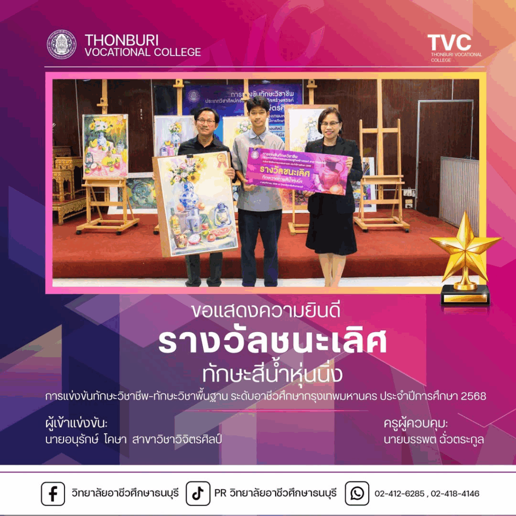 วิทยาลัยอาชีวศึกษาธนบุรีสร้างความภาคภูมิใจอีกครั้ง โดยคว้ารางวัล ชนะเลิศการแข่งขันทักษะสีน้ำหุ่นนิ่ง