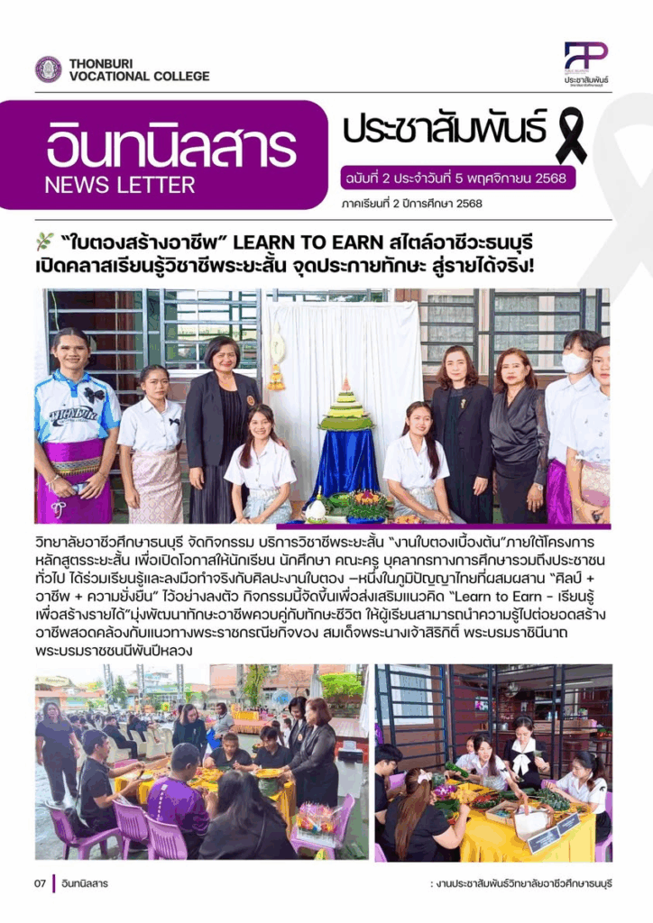 วิทยาลัยอาชีวศึกษาธนบุรี จัดกิจกรรม บริการวิชาชีพระยะสั้น “งานใบตองเบื้องต้น”ภายใต้โครงการหลักสูตรระยะสั้น เพื่อเปิดโอกาสให้นักเรียน นักศึกษา คณะครู บุคลากรทางการศึกษารวมถึงประชาชนทั่วไป ได้ร่วมเรียนรู้และลงมือทำจริงกับศิลปะงานใบตอง หนึ่งในภูมิปัญญาไทยที่ผสมผสาน “ศิลป์ + อาชีพ + ความยั่งยืน” ไว้อย่างลงตัว ![]()
