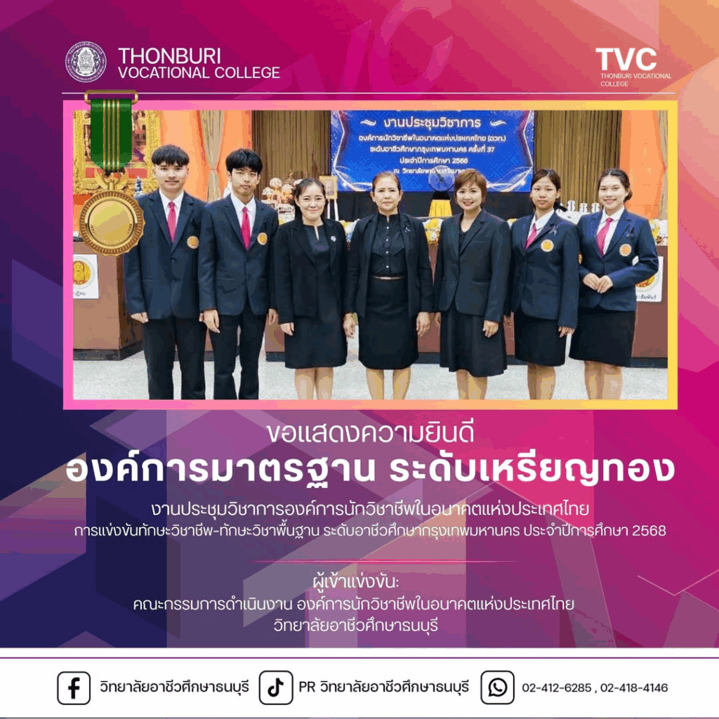 องค์การนักวิชาชีพในอนาคตแห่งประเทศไทย (อวท.) วิทยาลัยอาชีวศึกษาธนบุรี คว้ารางวัล “องค์การมาตรฐาน ระดับเหรียญทอง