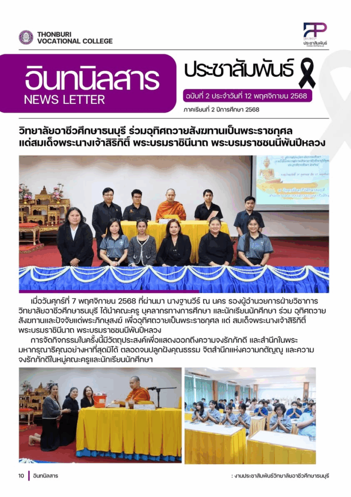 นางฐานวีร์ ณ นคร รองผู้อำนวยการฝ่ายวิชาการ วิทยาลัยอาชีวศึกษาธนบุรี ได้นำคณะครู บุคลากรทางการศึกษา และนักเรียนนักศึกษา ร่วม อุทิศถวายสังฆทานและปัจจัยแด่พระภิกษุสงฆ์ เพื่ออุทิศถวายเป็นพระราชกุศล แด่ สมเด็จพระนางเจ้าสิริกิติ์ พระบรมราชินีนาถ พระบรมราชชนนีพันปีหลวง
