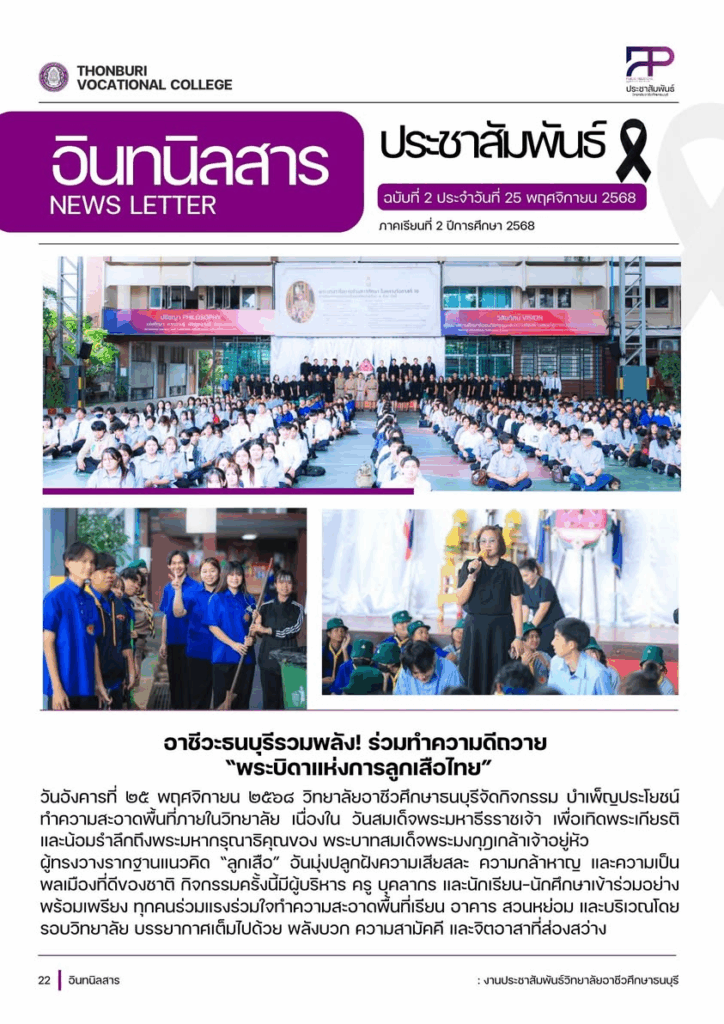 วิทยาลัยอาชีวศึกษาธนบุรีจัดกิจกรรม บำเพ็ญประโยชน์ ทำความสะอาดพื้นที่ภายในวิทยาลัย เนื่องใน วันสมเด็จพระมหาธีรราชเจ้า เพื่อเทิดพระเกียรติและน้อมรำลึกถึงพระมหากรุณาธิคุณของ