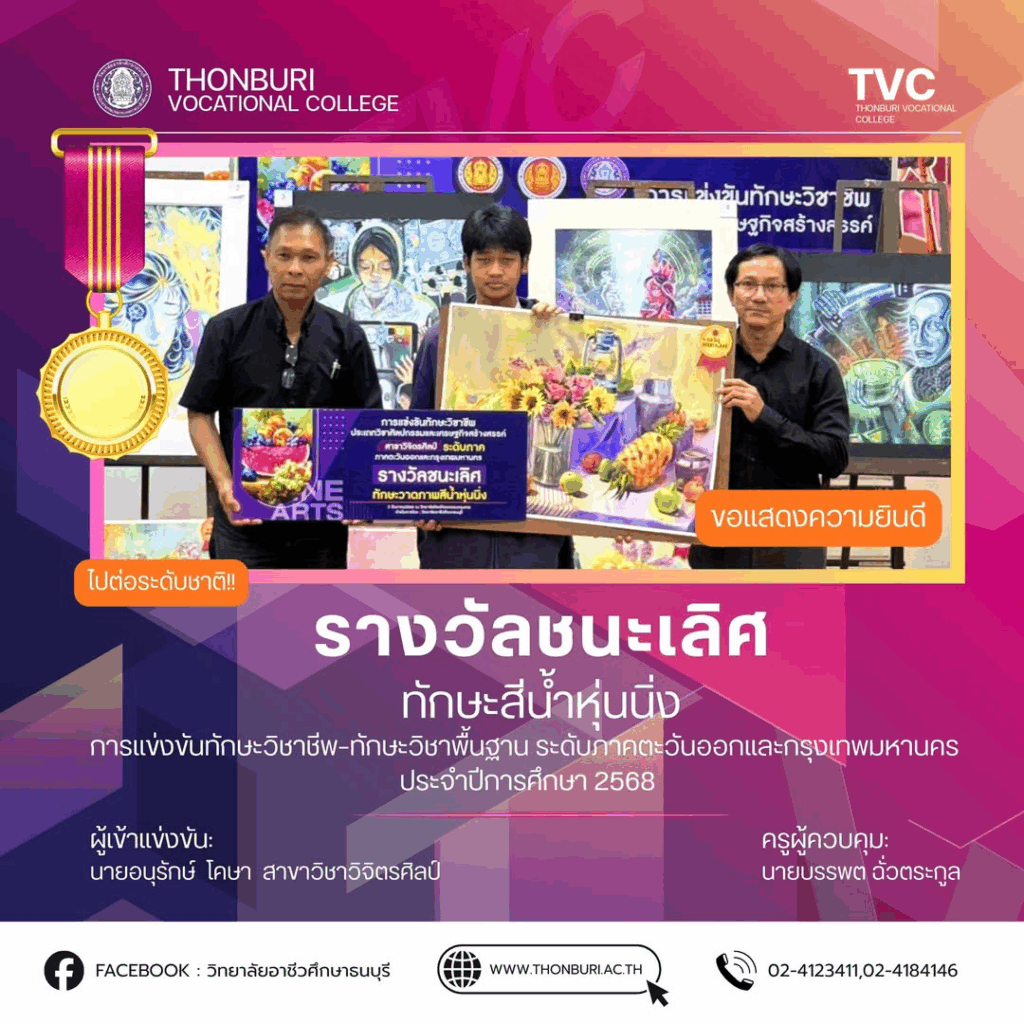 วิทยาลัยอาชีวศึกษาธนบุรี ขอแสดงความยินดีกับ นายอนุรักษ์ โคษา นักศึกษาสาขาวิชาวิจิตรศิลป์ ที่คว้ารางวัลชนะเลิศ