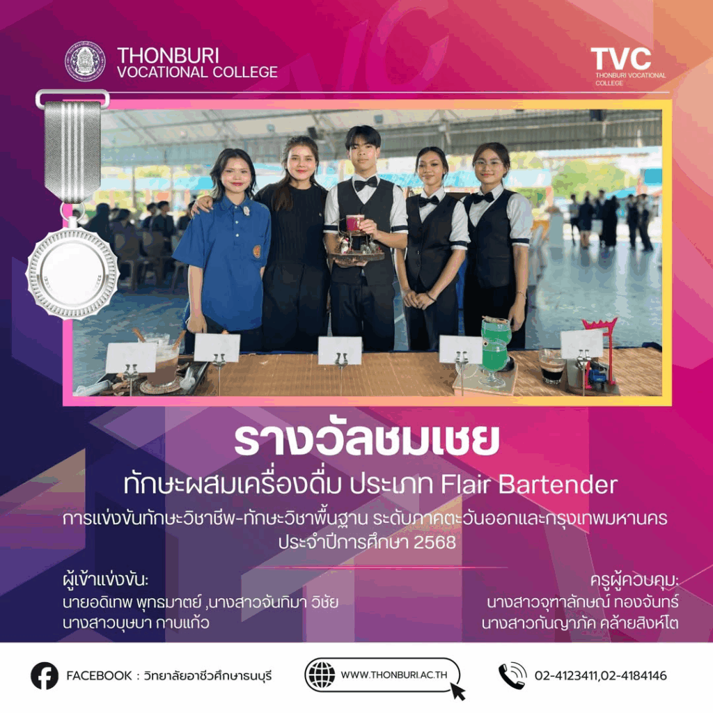 วิทยาลัยอาชีวศึกษาธนบุรี ขอแสดงความยินดีกับนักศึกษาสาขาที่เกี่ยวข้องด้านบริการอาหารและเครื่องดื่ม ที่คว้ารางวัล ชมเชย ในการแข่งขัน ทักษะผสมเครื่องดื่ม ประเภท Flair Bartender บนเวทีการแข่งขันทักษะวิชาชีพ–ทักษะวิชาพื้นฐาน ระดับภาคตะวันออกและกรุงเทพมหานคร ประจำปีการศึกษา 2568