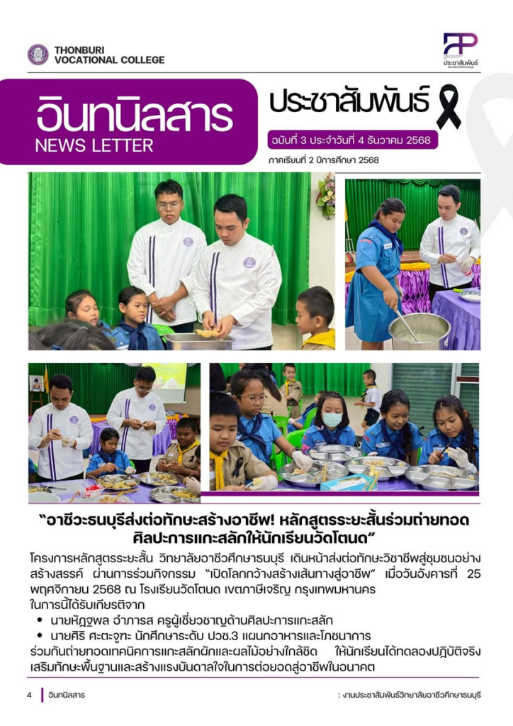 โครงการหลักสูตรระยะสั้น วิทยาลัยอาชีวศึกษาธนบุรี เดินหน้าส่งต่อทักษะวิชาชีพสู่ชุมชนอย่างสร้างสรรค์ ผ่านการร่วมกิจกรรม “เปิดโลกกว้างสร้างเส้นทางสู่อาชีพ” เมื่อวันอังคารที่ 25 พฤศจิกายน 2568 ณ โรงเรียนวัดโตนด เขตภาษีเจริญ กรุงเทพมหานคร