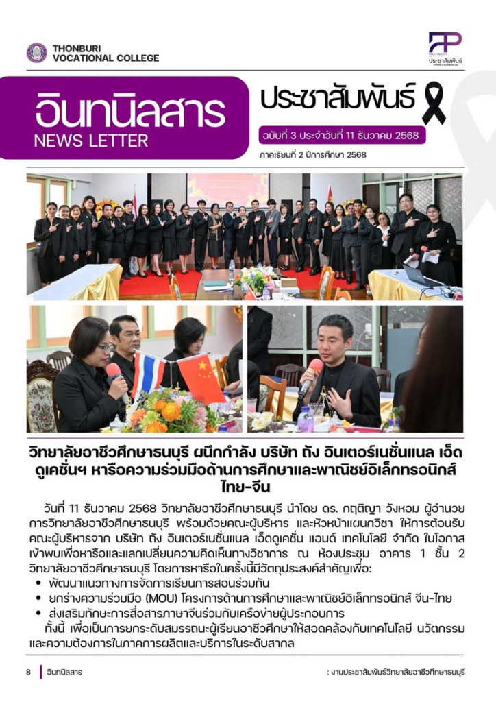 วันที่ 11 ธันวาคม 2568 วิทยาลัยอาชีวศึกษาธนบุรี นำโดย ดร.กฤติญา วังหอม ผู้อำนวยการวิทยาลัยอาชีวศึกษาธนบุรี พร้อมด้วยคณะผู้บริหาร และหัวหน้าแผนกวิชา ให้การต้อนรับคณะผู้บริหารจาก บริษัท ถัง อินเตอร์เนชั่นแนล เอ็ดดูเคชั่น แอนด์ เทคโนโลยี จำกัด ในโอกาสเข้าพบเพื่อหารือและแลกเปลี่ยนความคิดเห็นทางวิชาการ ณ ห้องประชุม อาคาร 1 ชั้น 2 วิทยาลัยอาชีวศึกษาธนบุรี
