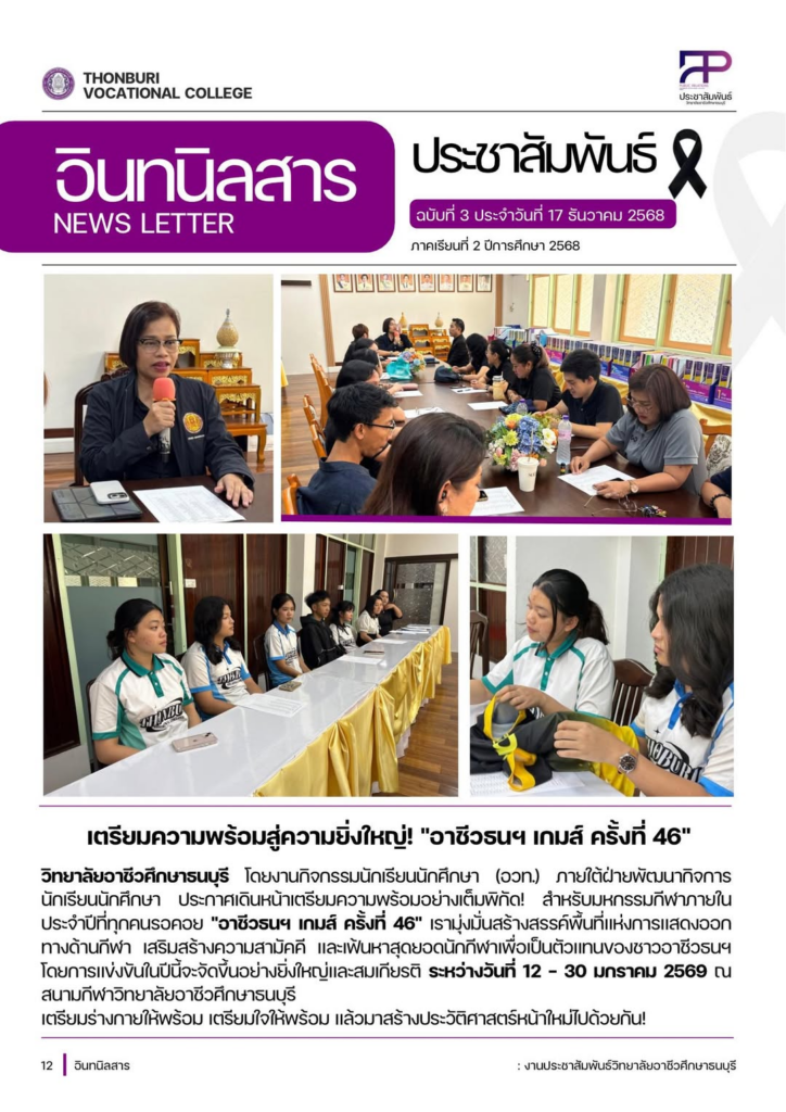 วิทยาลัยอาชีวศึกษาธนบุรี โดยงานกิจกรรมนักเรียนนักศึกษา (อวท.) ฝ่ายพัฒนากิจการนักเรียนนักศึกษา เดินหน้าเตรียมความพร้อมสำหรับการแข่งขันกีฬาภายในประจำปีที่ทุกคนรอคอย “อาชีวธนฯ เกมส์ ครั้งที่ 46” ซึ่งจะจัดขึ้นอย่างยิ่งใหญ่ระหว่างวันที่ 12 – 30 มกราคม 2569 นี้
