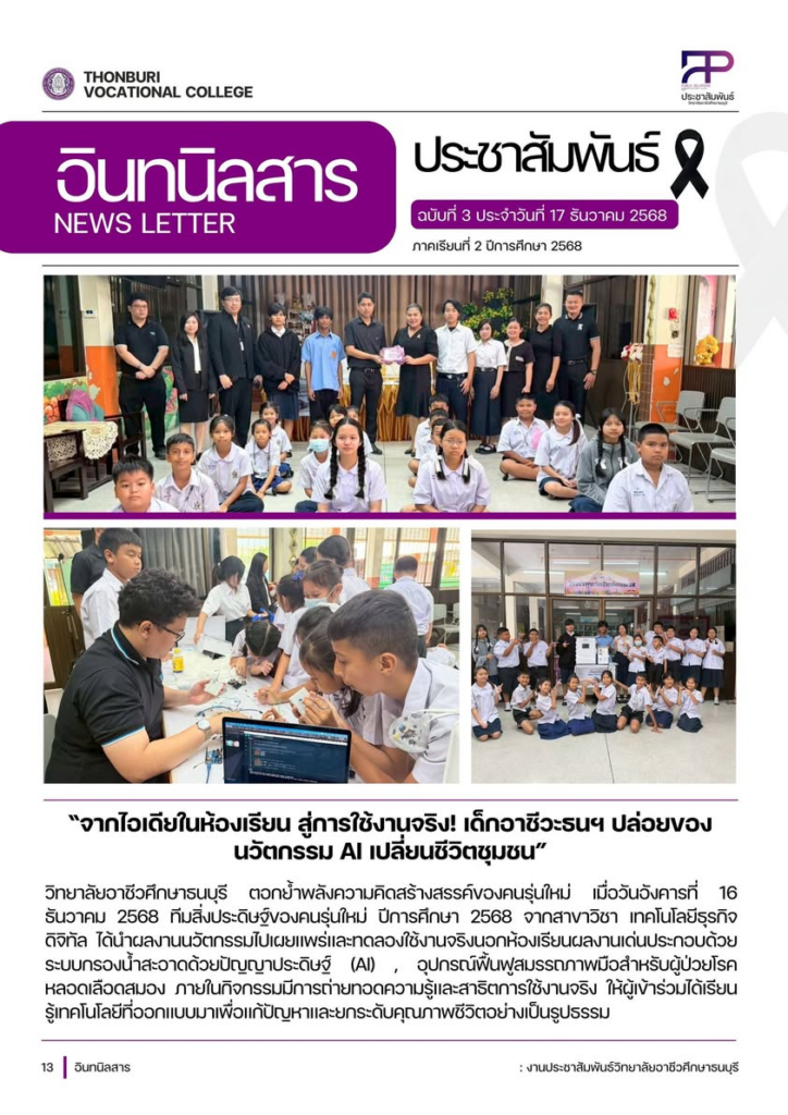 เมื่อวันอังคารที่ 16 ธันวาคม 2568 ทีมสิ่งประดิษฐ์ของคนรุ่นใหม่ ปีการศึกษา 2568 จากสาขาวิชา เทคโนโลยีธุรกิจดิจิทัล ได้นำผลงานนวัตกรรมไปเผยแพร่และทดลองใช้งานจริงนอกห้องเรียน
