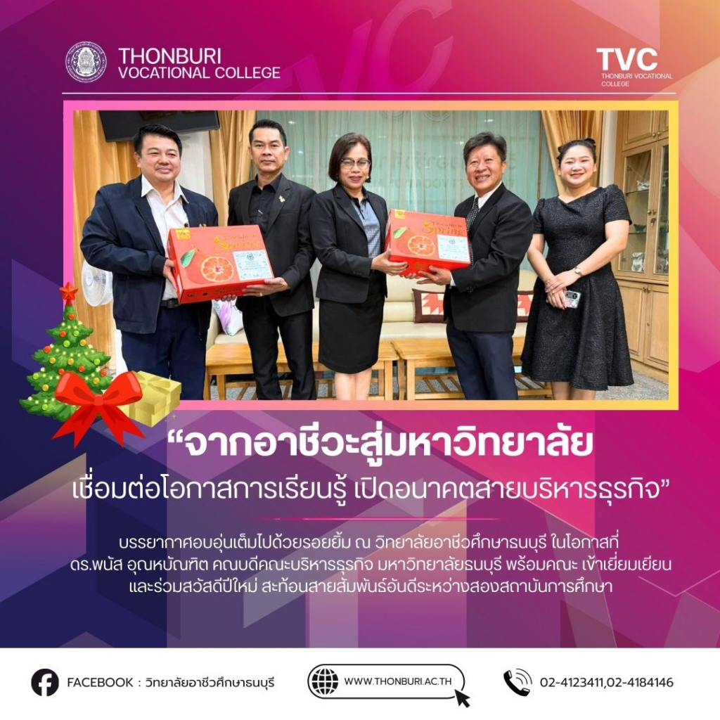 บรรยากาศอบอุ่นเต็มไปด้วยรอยยิ้ม ณ วิทยาลัยอาชีวศึกษาธนบุรี ในโอกาสที่ ดร.พนัส อุณหบัณฑิต คณบดีคณะบริหารธุรกิจ มหาวิทยาลัยธนบุรี พร้อมคณะ เข้าเยี่ยมเยียนและร่วมสวัสดีปีใหม่ สะท้อนสายสัมพันธ์อันดีระหว่างสองสถาบันการศึกษา