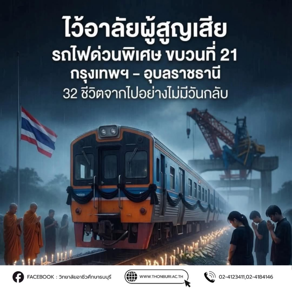 วิทยาลัยอาชีวศึกษาธนบุรี ขอแสดงความเสียใจอย่างสุดซึ้งต่อเหตุการณ์อันน่าเศร้า จากอุบัติเหตุรถไฟด่วนพิเศษ ขบวนที่ 21 เส้นทางกรุงเทพมหานคร – อุบลราชธานี ซึ่งส่งผลให้มีผู้เสียชีวิตจำนวน 32 ราย เป็นความสูญเสียที่สร้างความสะเทือนใจแก่ครอบครัวผู้สูญเสียและสังคมไทยเป็นอย่างยิ่ง
