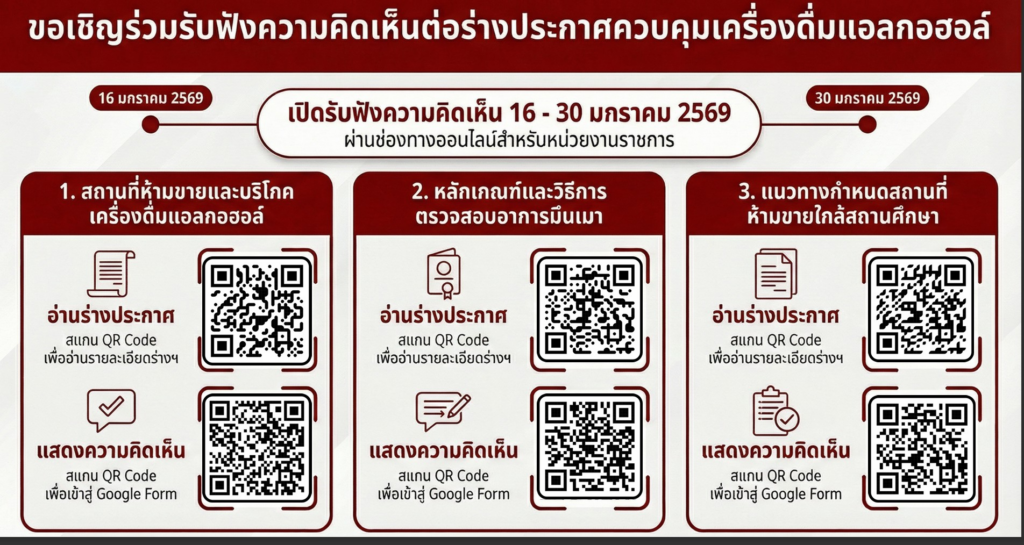 กรมควบคุมโรค เปิดโอกาสให้หน่วยงานภาครัฐและผู้เกี่ยวข้อง ร่วมแสดงความคิดเห็นต่อ ร่างประกาศคณะกรรมการควบคุมเครื่องดื่มแอลกอฮอล์ เพื่อพัฒนามาตรการด้านสาธารณสุขและความปลอดภัยของสังคมไทยให้สอดคล้องกับบริบทปัจจุบัน