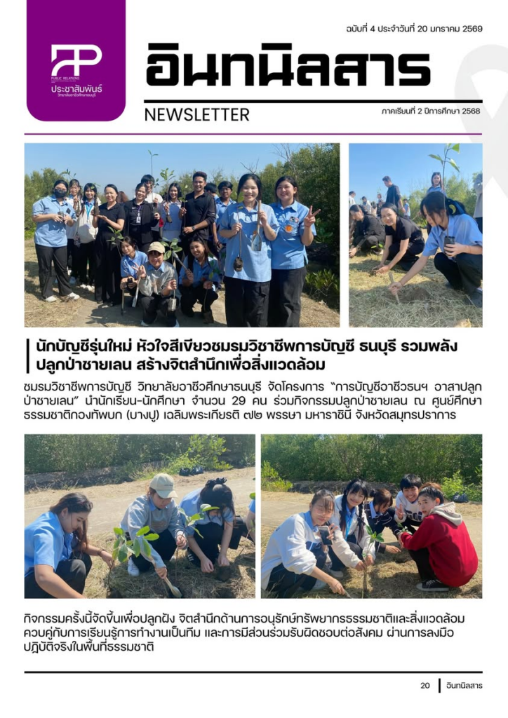 ชมรมวิชาชีพการบัญชี วิทยาลัยอาชีวศึกษาธนบุรี จัดโครงการ “การบัญชีอาชีวธนฯ อาสาปลูกป่าชายเลน” นำนักเรียน–นักศึกษา จำนวน 29 คน ร่วมกิจกรรมปลูกป่าชายเลน ณ ศูนย์ศึกษาธรรมชาติกองทัพบก (บางปู) เฉลิมพระเกียรติ ๗๒ พรรษา มหาราชินี จังหวัดสมุทรปราการ