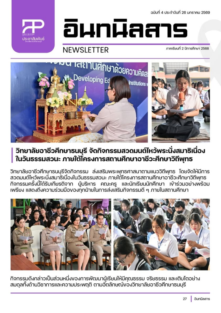 วิทยาลัยอาชีวศึกษาธนบุรีจัดกิจกรรม ส่งเสริมพระพุทธศาสนาตามแนววิถีพุทธ โดยจัดให้มีการ สวดมนต์ไหว้พระนั่งสมาธิเนื่องในวันธรรมสวนะ ภายใต้โครงการสถานศึกษาอาชีวะศึกษาวิถีพุทธ