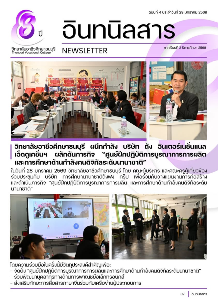 วันที่ 28 มกราคม 2569 วิทยาลัยอาชีวศึกษาธนบุรี โดย คณะผู้บริหาร และคณะครูผู้เกี่ยวข้อง ร่วมประชุมกับ บริษัท การศึกษานานาชาติถังฟง กรุ๊ป เพื่อร่วมกันวางแผนงานการก่อสร้างและดำเนินภารกิจ “ศูนย์ฝึกปฏิบัติการบูรณาการการผลิตและการศึกษาด้านกำลังคนดิจิทัลระดับนานาชาติ” ณ ห้องปฏิบัติการทางด้านภาษาจีน อาคาร 1 ชั้น 3 วิทยาลัยอาชีวศึกษาธนบุรี