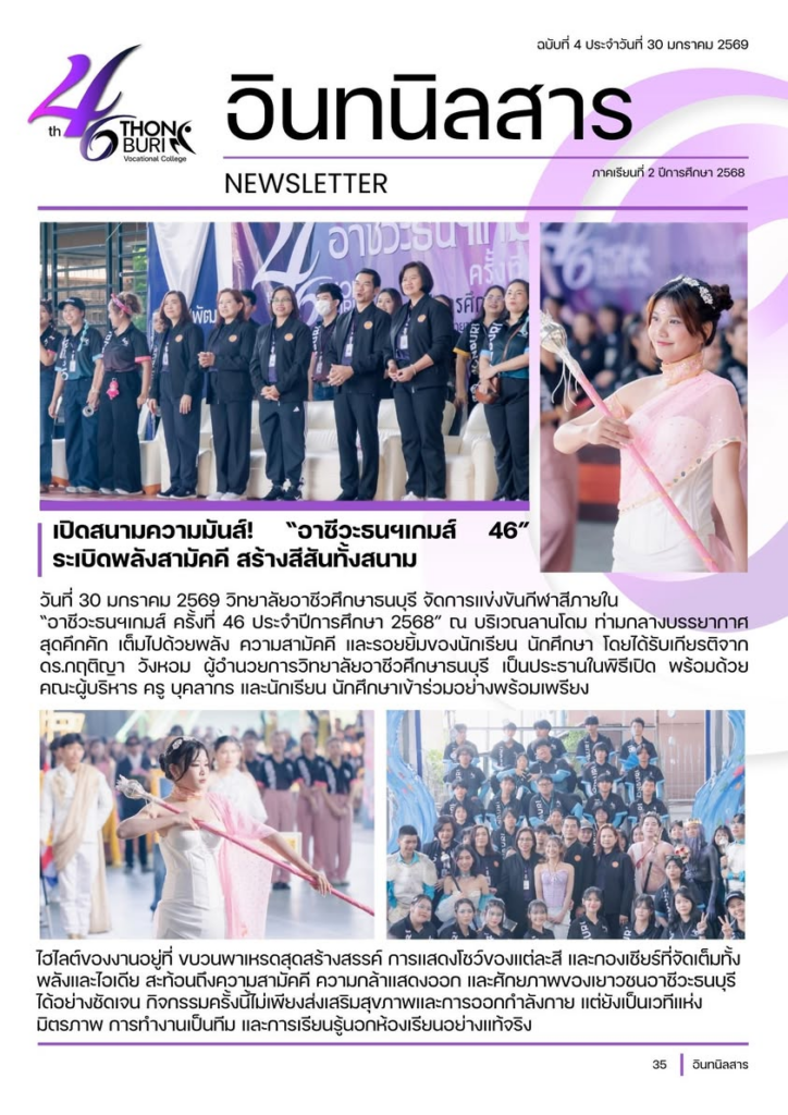 30 มกราคม 2569 วิทยาลัยอาชีวศึกษาธนบุรี จัดการแข่งขันกีฬาสีภายใน “อาชีวะธนฯเกมส์ ครั้งที่ 46 ประจำปีการศึกษา 2568” ณ บริเวณลานโดม ท่ามกลางบรรยากาศสุดคึกคัก เต็มไปด้วยพลัง ความสามัคคี และรอยยิ้มของนักเรียน นักศึกษา
