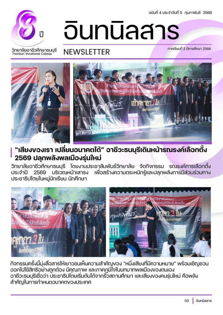 วิทยาลัยอาชีวศึกษาธนบุรี โดยงานประชาสัมพันธ์วิทยาลัย จัดกิจกรรม รณรงค์การเลือกตั้ง ประจำปี 2569 บริเวณหน้าเสาธง เพื่อสร้างความตระหนักรู้และปลุกพลังการมีส่วนร่วมทางประชาธิปไตยในหมู่นักเรียน นักศึกษา
