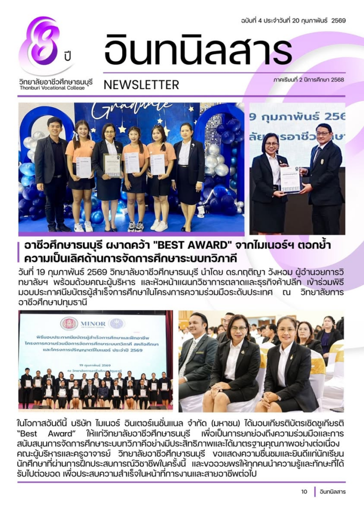 ในโอกาสอันดีนี้ บริษัท ไมเนอร์ อินเตอร์เนชั่นแนล จำกัด (มหาชน) ได้มอบเกียรติบัตรเชิดชูเกียรติ “Best Award” ให้แก่วิทยาลัยอาชีวศึกษาธนบุรี เพื่อเป็นการยกย่องถึงความร่วมมือและการสนับสนุนการจัดการศึกษาระบบทวิภาคีอย่างมีประสิทธิภาพและได้มาตรฐานคุณภาพอย่างต่อเนื่อง