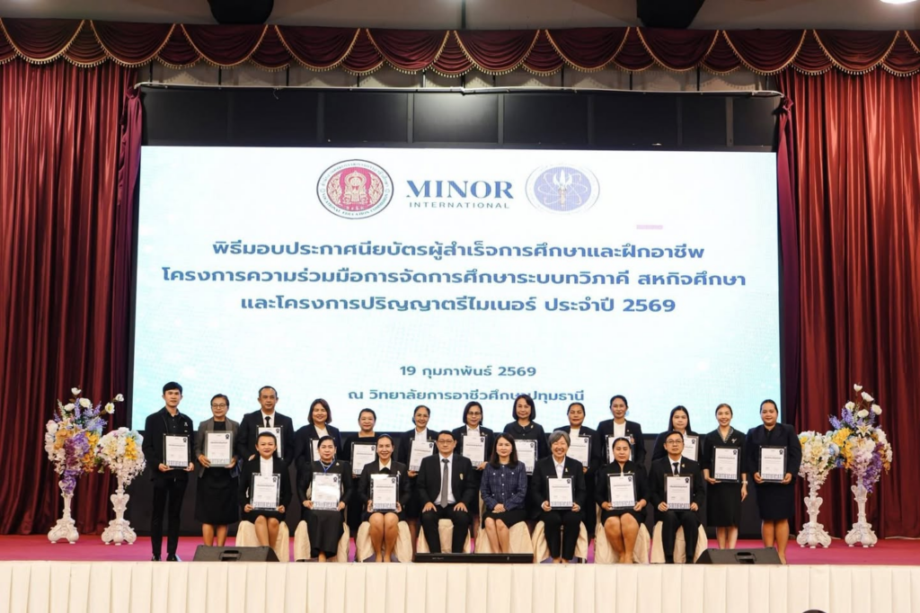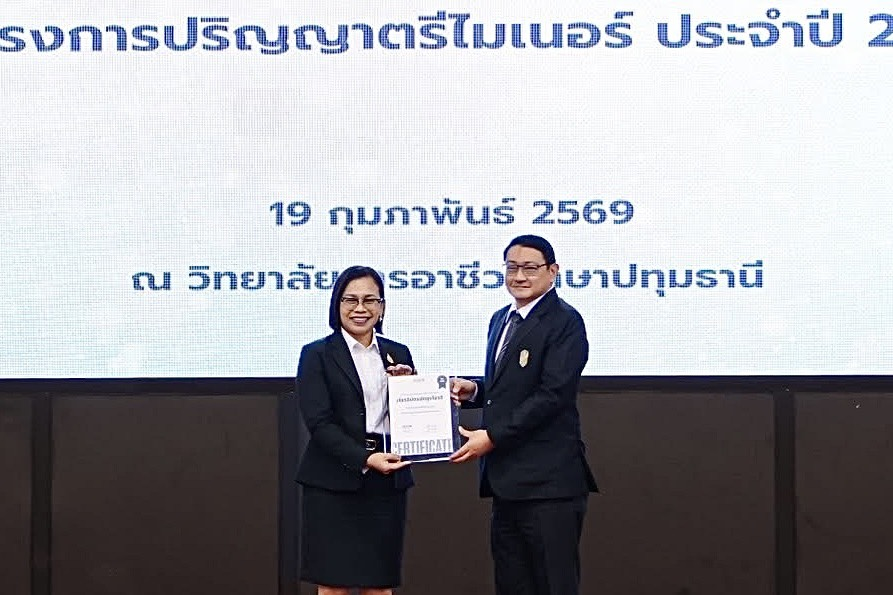 เมื่อวันที่ 19 กุมภาพันธ์ 2569 ดร.กฤติญา วังหอม ผู้อำนวยการวิทยาลัยอาชีวศึกษาธนบุรี พร้อมด้วย นางฐานวีร์ ณ นคร รองผู้อำนวยการฝ่ายวิชาการ นายจตุพงศ์ ภูอาวุธ หัวหน้าแผนกวิชาการตลาดและธุรกิจค้าปลีก และนักเรียนนักศึกษา ได้เข้าร่วมพิธีมอบประกาศนียบัตรผู้สำเร็จการศึกษาและฝึกอาชีพ ภายใต้โครงการความร่วมมือการจัดการศึกษาระบบทวิภาคี สหกิจศึกษา และโครงการปริญญาตรีไมเนอร์ ประจำปี 2569 ณ ห้องประชุมปทุมรัตน์ วิทยาลัยการอาชีวศึกษาปทุมธานี จังหวัดปทุมธานี