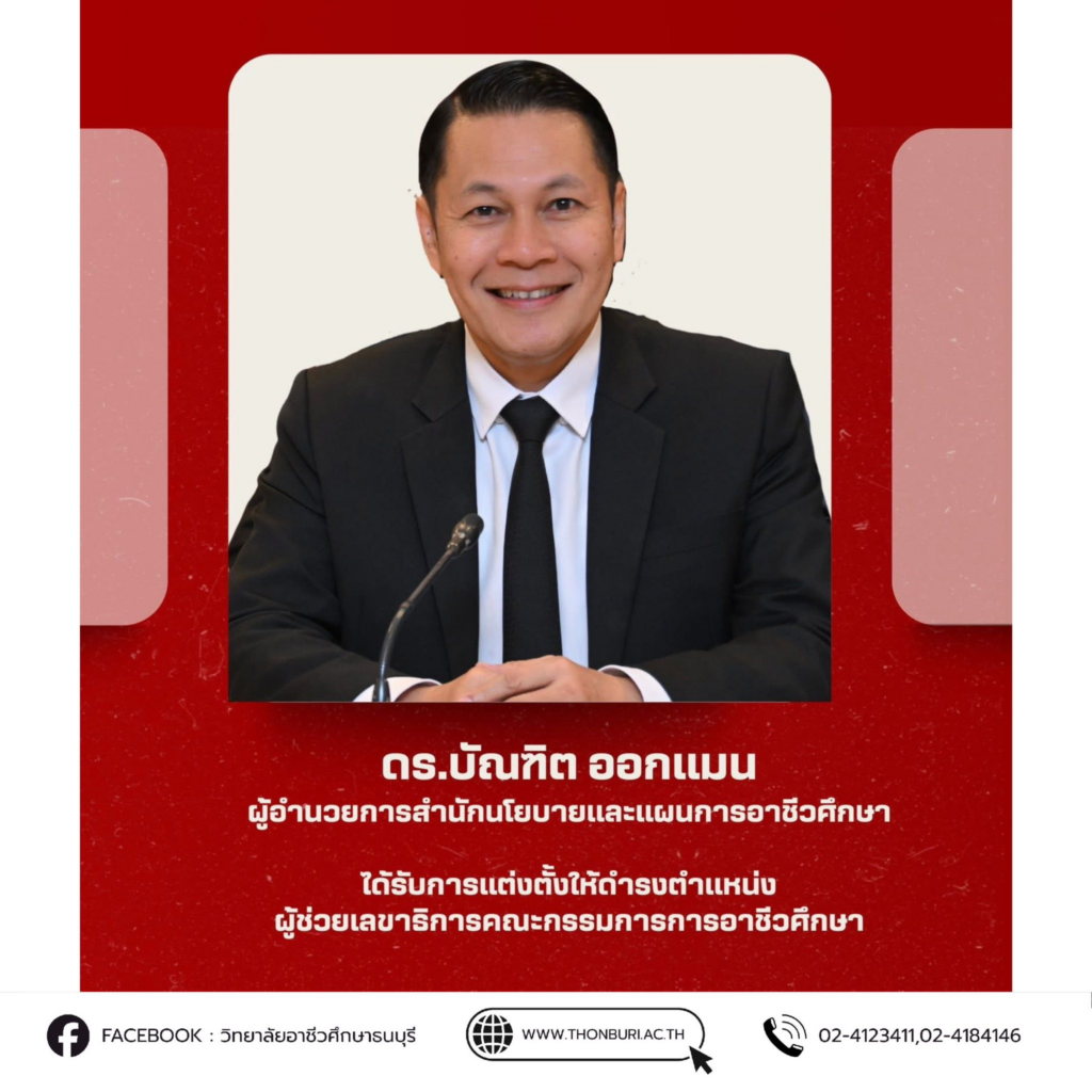 ดร.บัณฑิต ออกแมน ผู้อำนวยการสำนักนโยบายและแผนการอาชีวศึกษา ได้รับการแต่งตั้งให้ดำรงตำแหน่ง ผู้ช่วยเลขาธิการคณะกรรมการการอาชีวศึกษา