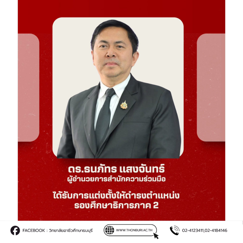 ดร.ธนภัทร แสงจันทร์ ผู้อำนวยการสำนักความร่วมมือ ได้รับการแต่งตั้งให้ดำรงตำแหน่ง รองศึกษาธิการภาค สำนักงานศึกษาธิการภาค 2