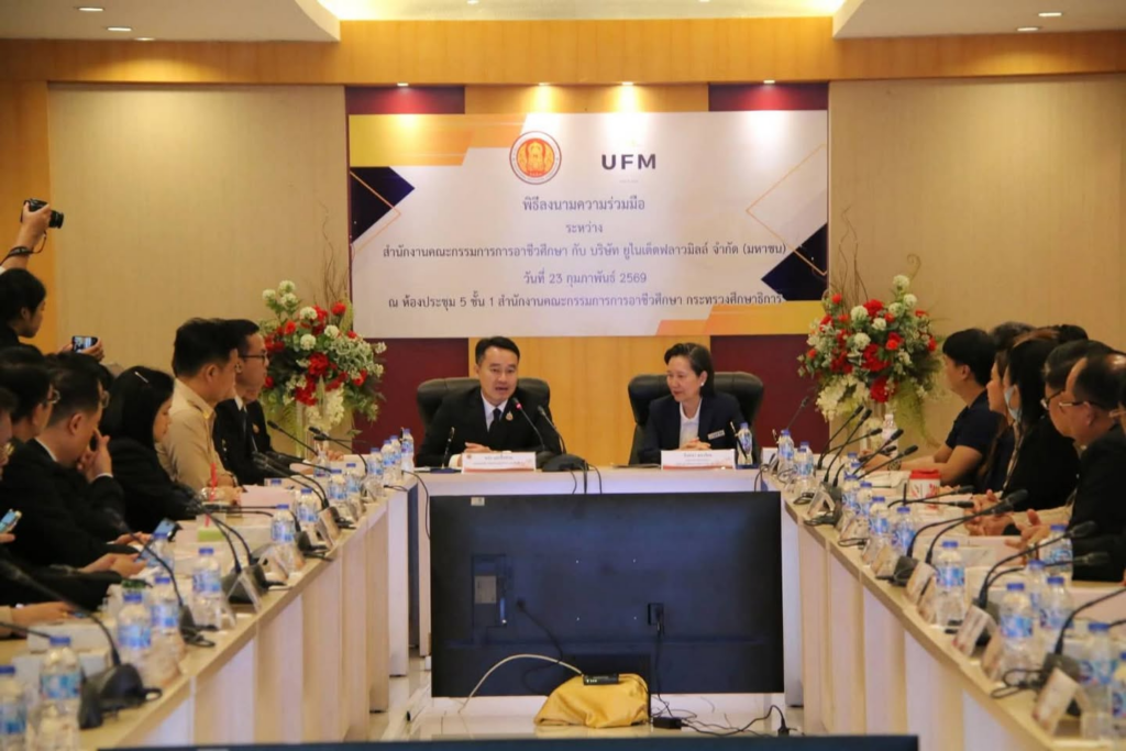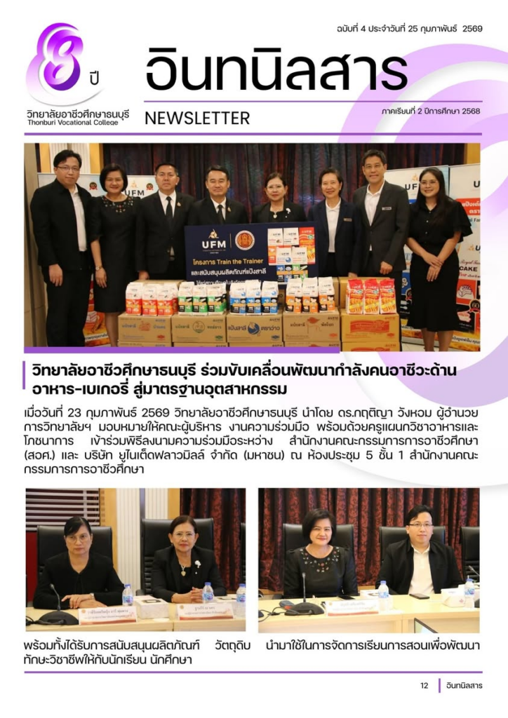 เมื่อวันที่ 23 กุมภาพันธ์ 2569 วิทยาลัยอาชีวศึกษาธนบุรี นำโดย ดร.กฤติญา วังหอม ผู้อำนวยการวิทยาลัยฯ มอบหมายให้คณะผู้บริหาร งานความร่วมมือ พร้อมด้วยครูแผนกวิชาอาหารและโภชนาการ เข้าร่วมพิธีลงนามความร่วมมือระหว่าง สำนักงานคณะกรรมการการอาชีวศึกษา (สอศ.) และ บริษัท ยูไนเต็ดฟลาวมิลล์ จำกัด (มหาชน) ณ ห้องประชุม 5 ชั้น 1 สำนักงานคณะกรรมการการอาชีวศึกษา พร้อมทั้งได้รับการสนับสนุนผลิตภัณฑ์ วัตถุดิบ นำมาใช้ในการจัดการเรียนการสอนเพื่อพัฒนาทักษะวิชาชีพให้กับนักเรียน นักศึกษา