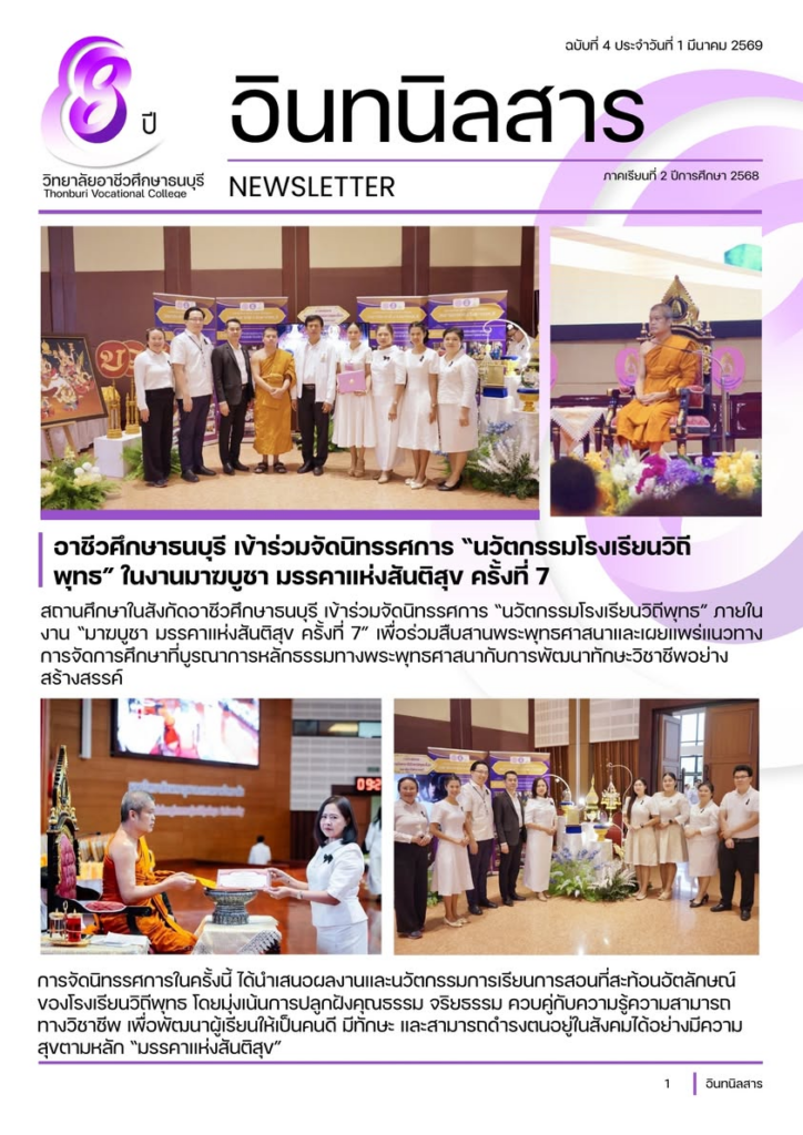 สถานศึกษาในสังกัดอาชีวศึกษาธนบุรี เข้าร่วมจัดนิทรรศการ “นวัตกรรมโรงเรียนวิถีพุทธ” ภายในงาน “มาฆบูชา มรรคาแห่งสันติสุข ครั้งที่ 7” เพื่อร่วมสืบสานพระพุทธศาสนาและเผยแพร่แนวทางการจัดการศึกษาที่บูรณาการหลักธรรมทางพระพุทธศาสนากับการพัฒนาทักษะวิชาชีพอย่างสร้างสรรค์