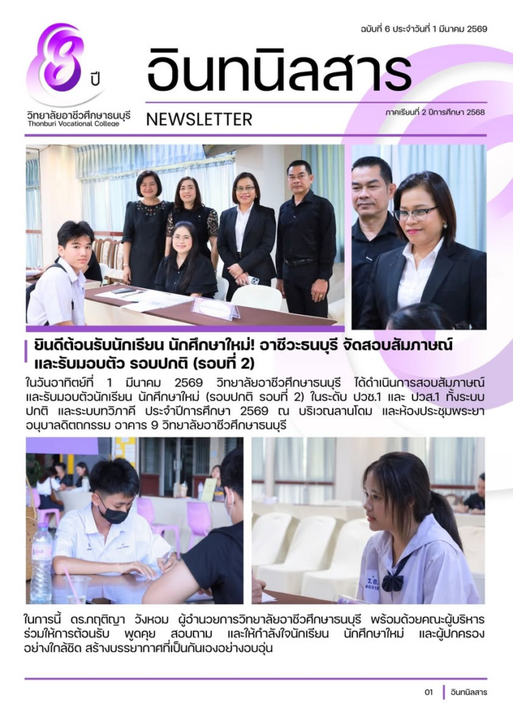 ในวันอาทิตย์ที่ 1 มีนาคม 2569 วิทยาลัยอาชีวศึกษาธนบุรี ได้ดำเนินการสอบสัมภาษณ์ และรับมอบตัวนักเรียน นักศึกษาใหม่ (รอบปกติ รอบที่ 2) ในระดับ ปวช.1 และ ปวส.1 ทั้งระบบปกติ และระบบทวิภาคี ประจำปีการศึกษา 2569 ณ บริเวณลานโดม และห้องประชุมพระยาอนุบาลดิตถกรรม อาคาร 9 วิทยาลัยอาชีวศึกษาธนบุรี