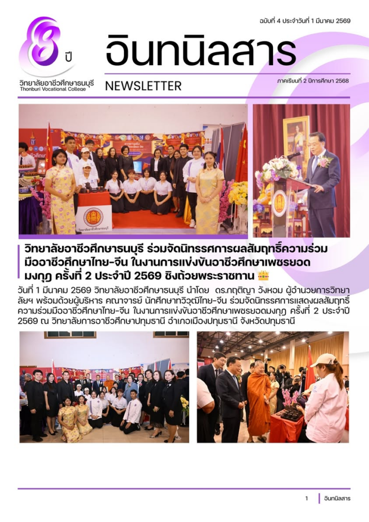วันที่ 1 มีนาคม 2569 วิทยาลัยอาชีวศึกษาธนบุรี นำโดย ดร.กฤติญา วังหอม ผู้อำนวยการวิทยาลัยฯ พร้อมด้วยผู้บริหาร คณาจารย์ นักศึกษาทวิวุฒิไทย-จีน ร่วมจัดนิทรรศการแสดงผลสัมฤทธิ์ความร่วมมืออาชีวศึกษาไทย-จีน ในงานการแข่งขันอาชีวศึกษาเพชรยอดมงกุฎ ครั้งที่ 2 ประจำปี 2569 ณ วิทยาลัยการอาชีวศึกษาปทุมธานี อำเภอเมืองปทุมธานี จังหวัดปทุมธานี