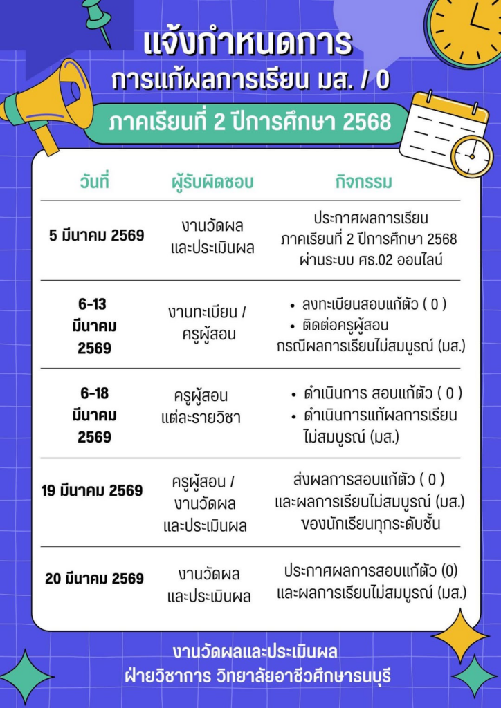 วิทยาลัยอาชีวศึกษาธนบุรี ขอแจ้งกำหนดการดำเนินการแก้ผลการเรียนของนักเรียนนักศึกษา ภาคเรียนที่ 2 ปีการศึกษา 2568 โดยมีรายละเอียดดังนี้